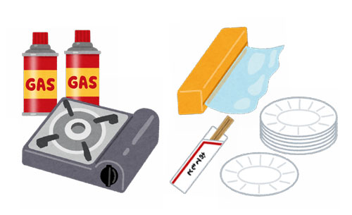 (カセットコンロ、ガスボンベ、紙皿、割りばし、スプーン、ラップなど)