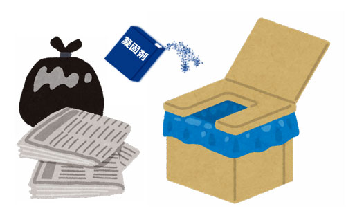 簡易トイレ、凝固剤、ビニール袋、新聞紙