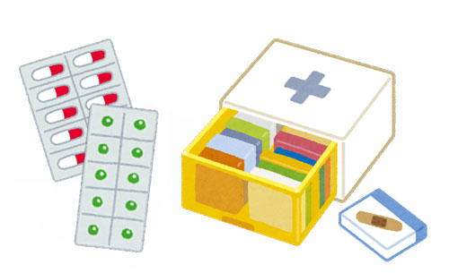 (絆創膏、消毒薬、ガーゼ、包帯、解熱剤、胃腸薬、風邪薬など)